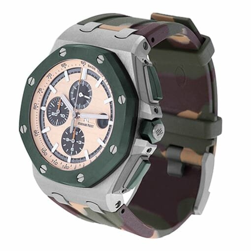 This Audemars Piguet Royal Oak 26400SO.OO.A054CA.01 replica watch is a perfect 1:1 clone of the original. It features a 904L stainless steel case and bezel. with a sapphire crystal and a 44.00 mm size and 14.04 mm thickness. The green rubber bracelet is adjustable for all sizes and has a 904L stainless steel AP pin buckle. The champagne dial has stick and dot indices. 904L stainless steel Royal Oak hour-marker. and stick hands. It has an automatic AP 3126/3840 movement with a 60-hour power reserve and a precision of (-3/+3 sec/day) within COSC certification limits. The watch has passed the 30m water resistance test and is under a full 2-year international United Luxury warranty.This watch is a perfect clone of the original. with all the same markings. writings. thickness. size. and powerful movement and caliber. Not even your jeweler can tell the difference! For Japanese mechanism watches. materials and movements may differ from the Swiss mechanism watches. so please contact our support team for more information and videos.