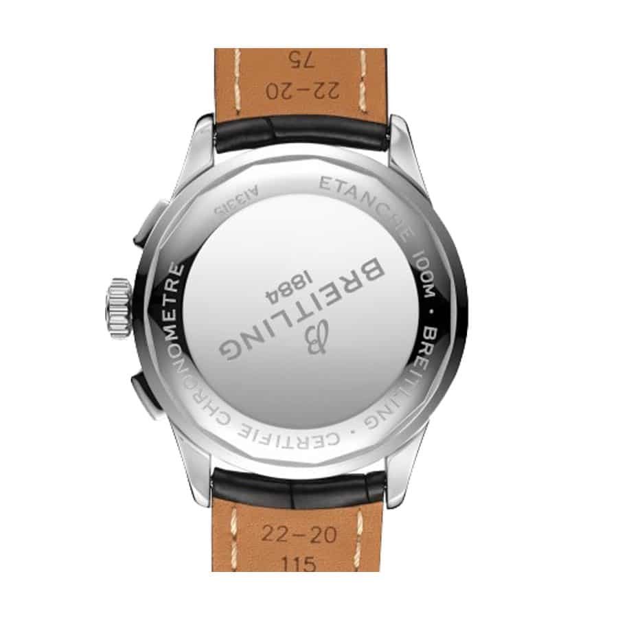 The Breitling Premier Automatic Chronometer Black Dial A13315351B1P2 Replica is a luxury watch. It features a 904L stainless steel case with a silver-tone finish and a sapphire crystal. The movement is an automatic Breitling caliber B13 with a power reserve of 60 hours and a precision of (-3/+3 sec/day) within COSC certification limits. The dial is black with stick indices and 904L stainless steel stick hands. The bracelet is made of alligator/crocodile leather with an adjustable link and a 904L stainless steel tang clasp.