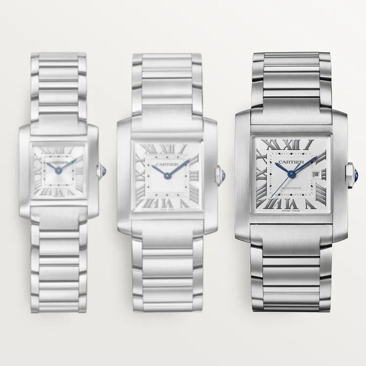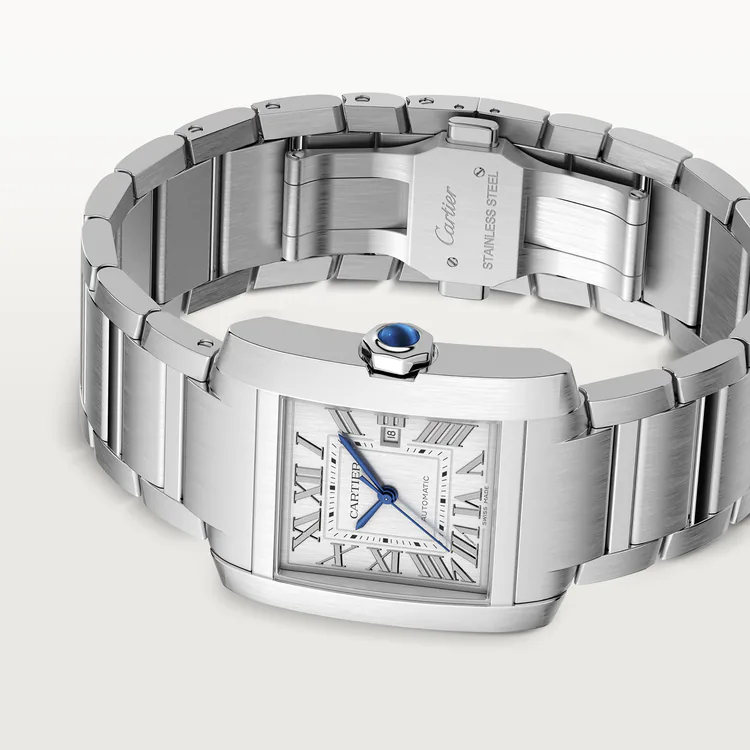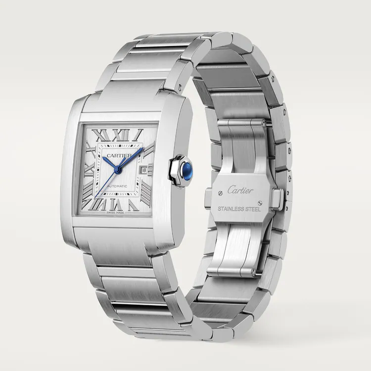 Tank Française watch, large model, mechanical movement with automatic winding. Steel case. Faceted crown in steel decorated with a synthetic cabochon-shaped spinel. Silvered dial, blued-steel sword-shaped hands, sapphire crystal. Steel bracelet. Case dimensions: 36.7 mm x 30.5 mm, thickness: 10.1 mm. Water-resistant up to 3 bar (approx. 30 meters/100 feet).
