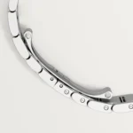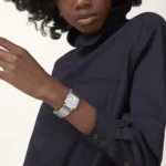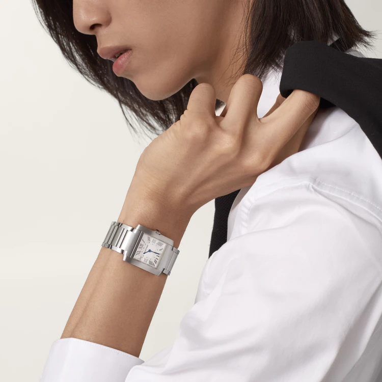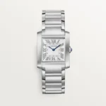 Tank Française watch, medium model, quartz movement. Steel case. Faceted crown in steel decorated with a synthetic cabochon-shaped spinel. Silvered dial, blued-steel sword-shaped hands, sapphire crystal. Steel bracelet. Case dimensions: 32 mm x 27 mm, thickness: 7.1 mm. Water-resistant to 3 bar (approx. 30 meters/100 feet).