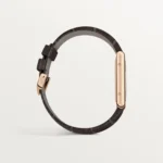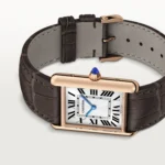 Tank Louis Cartier watch, large model, Manufacture mechanical movement with manual winding, caliber 1917MC. Case in rose gold 750/1000, beaded crown set with a sapphire cabochon, silvered beaded dial, blued-steel sword-shaped hands, mineral crystal, strap in semi-matte brown alligator skin, ardillon buckle in rose gold 750/1000. Case dimensions: 33.7 mm x 25.5 mm, 6.6 mm thick. Water-resistant to 3 bar (30 meters).