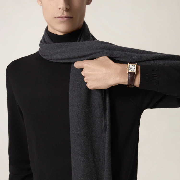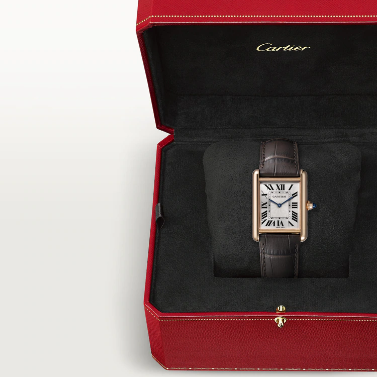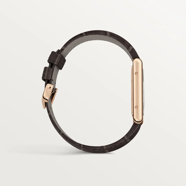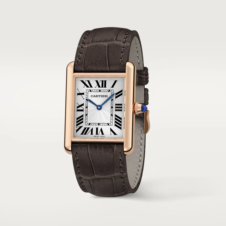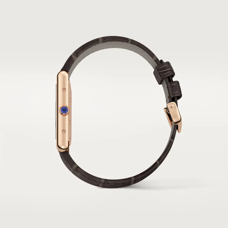 Tank Louis Cartier watch, large model, Manufacture mechanical movement with manual winding, caliber 1917MC. Case in rose gold 750/1000, beaded crown set with a sapphire cabochon, silvered beaded dial, blued-steel sword-shaped hands, mineral crystal, strap in semi-matte brown alligator skin, ardillon buckle in rose gold 750/1000. Case dimensions: 33.7 mm x 25.5 mm, 6.6 mm thick. Water-resistant to 3 bar (30 meters).