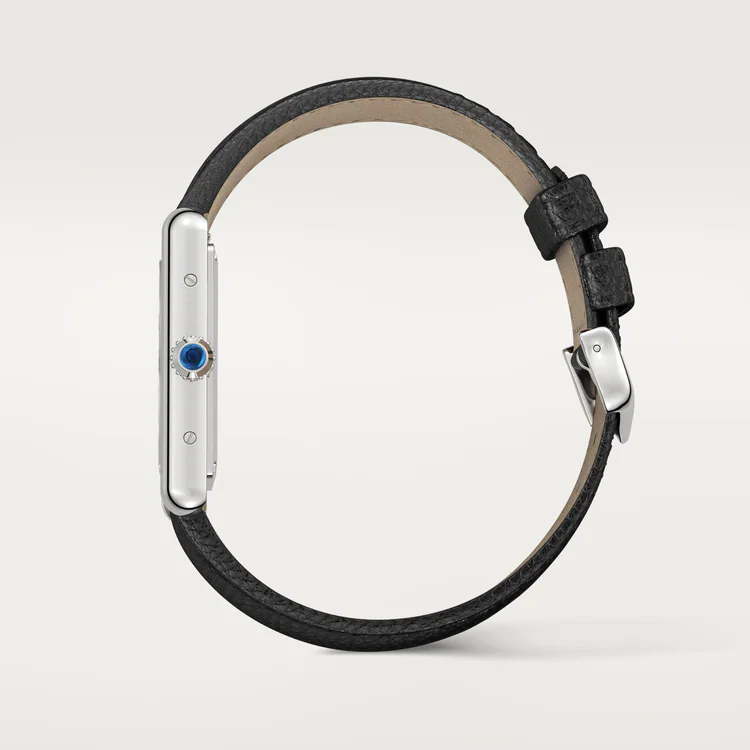 Tank Must watch, large model, high autonomy quartz movement. Steel case, beaded crown set with a synthetic cabochon-shaped spinel, silvered dial, blued-steel sword-shaped hands, interchangeable black grained calfskin strap, steel ardillon buckle. Case dimensions: 33.7 mm x 25.5 mm, thickness: 6.6 mm. Water-resistant up to 3 bar (approx. 30 meters/100 feet).