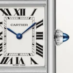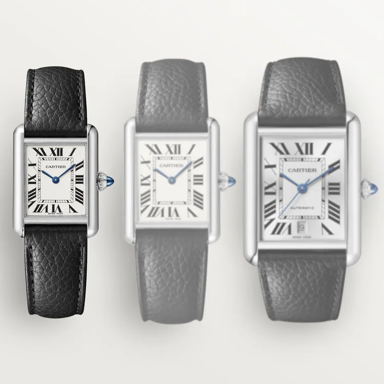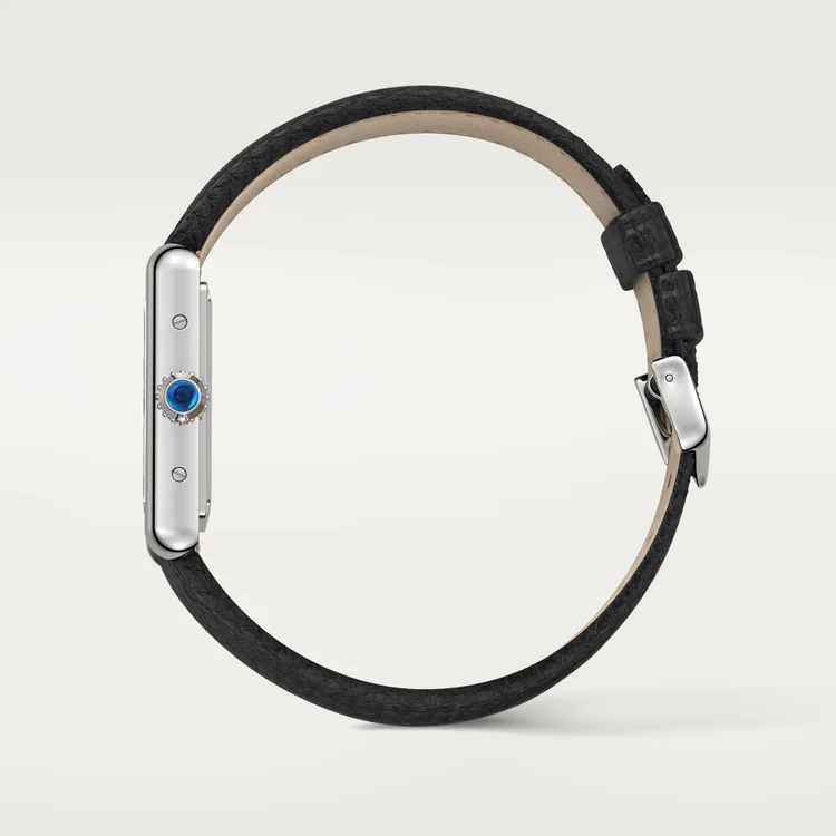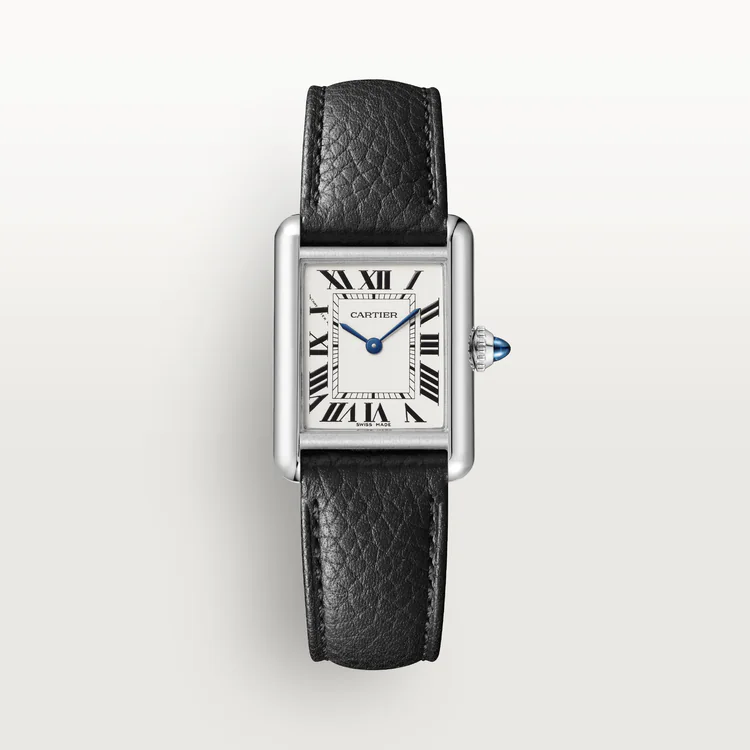 Tank Must watch, small model, high autonomy quartz movement. Steel case, beaded crown set with a synthetic cabochon-shaped spinel, silvered dial, blued-steel sword-shaped hands, interchangeable black grained calfskin strap, steel ardillon buckle. Case dimensions: 29.5 mm x 22 mm, thickness: 6.6 mm. Water-resistant up to 3 bar (approx. 30 meters/100 feet).