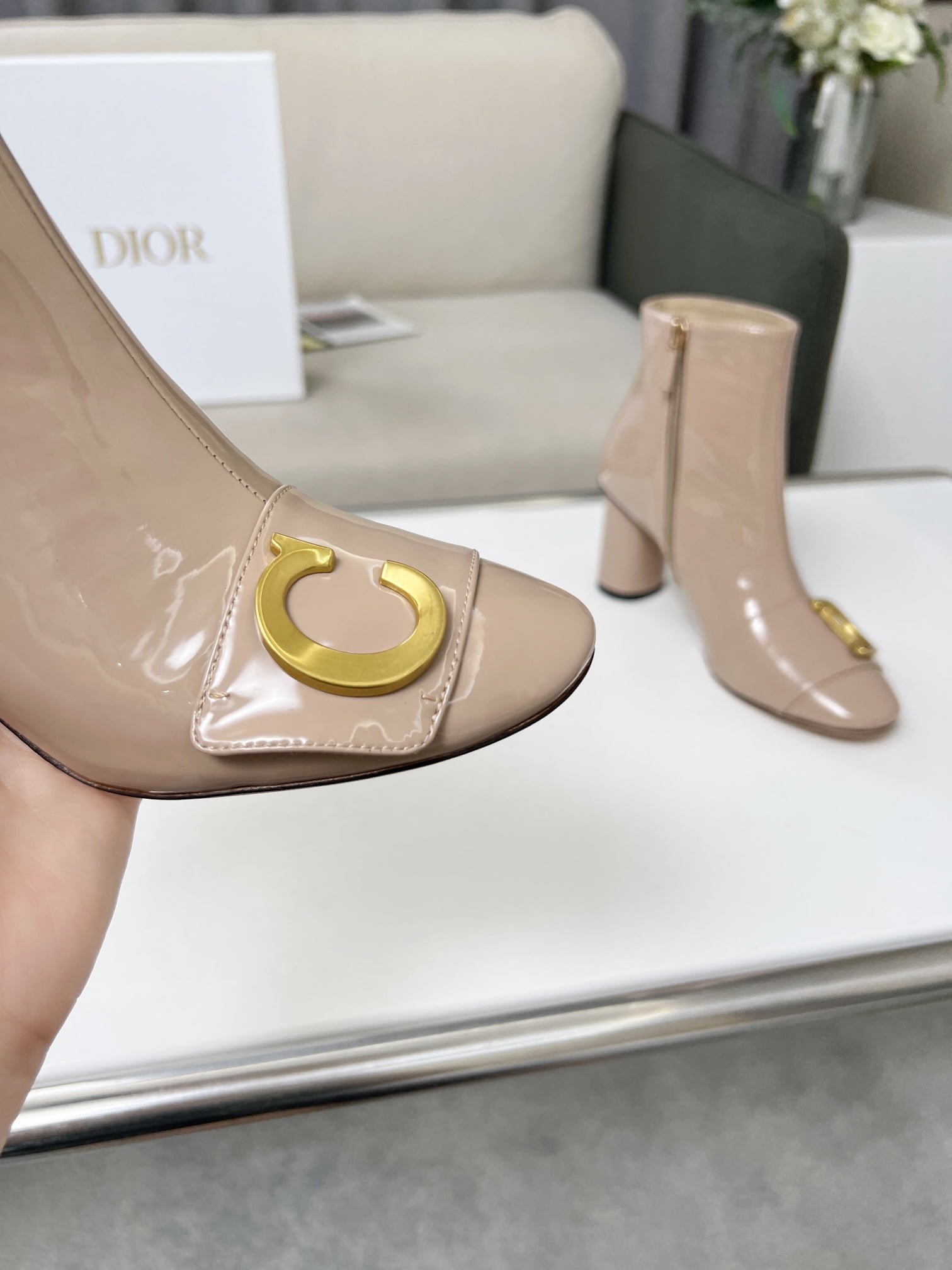 Dior 2023 autumn and winter new nude boots, the outside of the upper whole piece of soft patent leather constantly open, simple atmosphere. 🌹🌹🌹 with brand classic vintage hardware buckle. Patent leather mirror upper with 7.5cm heel height, ultra leg length. Can let you second change no problem temperament goddess 👄💗👄 Yang Jing color later