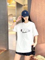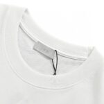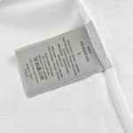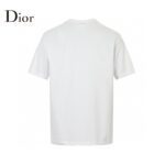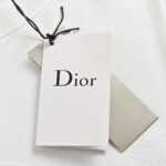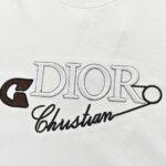 This Dior t-shirt features a unique design with the brand name and a stylized safety pin graphic. along with the signature Christian in elegant script. The clean white background emphasizes the bold and creative design. making it a fashionable and distinctive addition to any wardrobe.