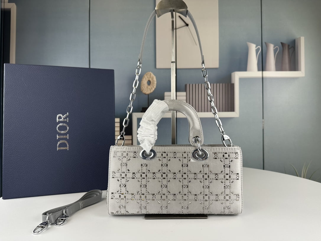 Dior satin diamond-encrusted Princess Diana bag grey 2320 size: 26*13*6cm
