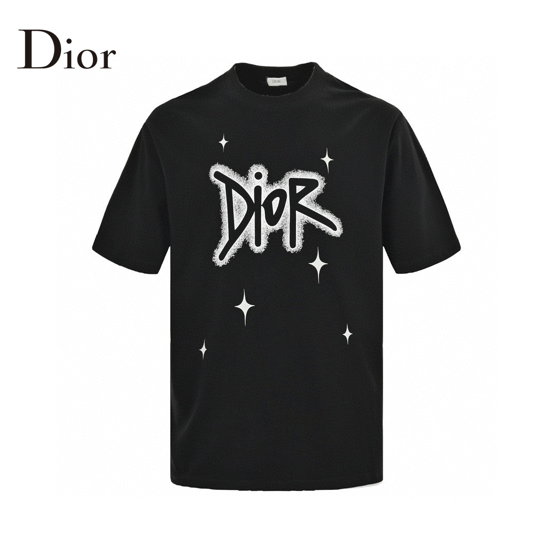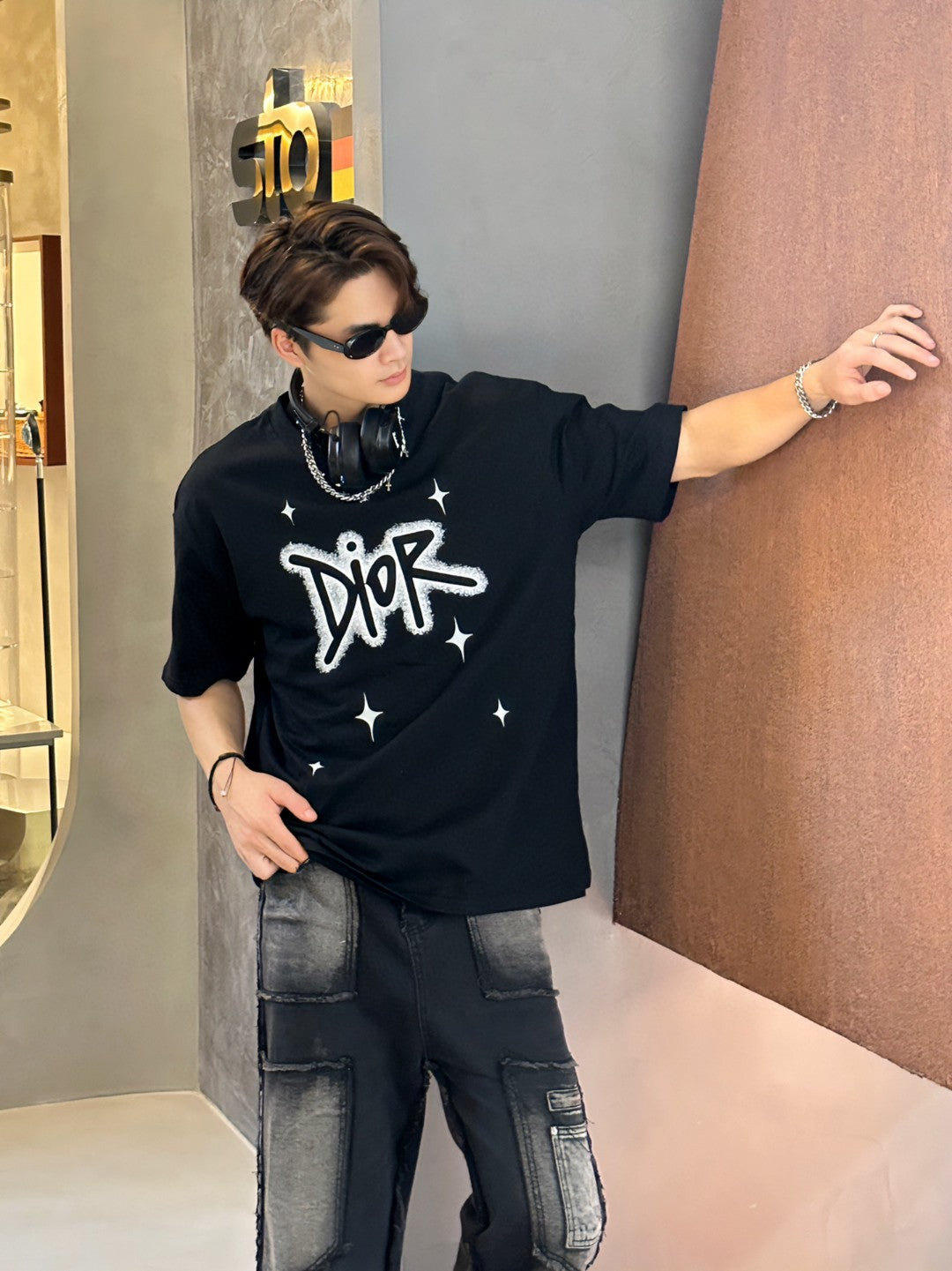 This Dior t-shirt features a striking design with the Dior logo and star elements scattered across the front. The high-quality