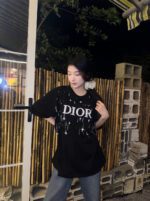 This Dior t-shirt features a bold oversized Dior logo in white on the front. The shirt is primarily black. offering