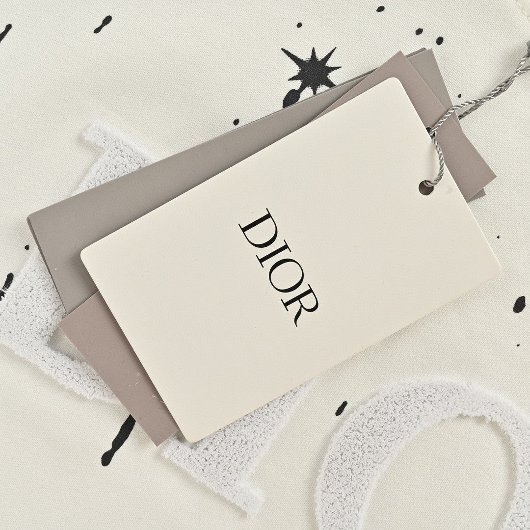 This Dior t-shirt features a bold oversized Dior logo in white on the front. The shirt is primarily black. offering