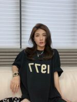 This Fear of God t-shirt features a minimalist black design. The front is adorned with the year 1977 in bold. off-white text. The clean lines and simple aesthetic make it perfect for a modern. casual look. Ideal for adding a touch of understated style to everyday outfits.