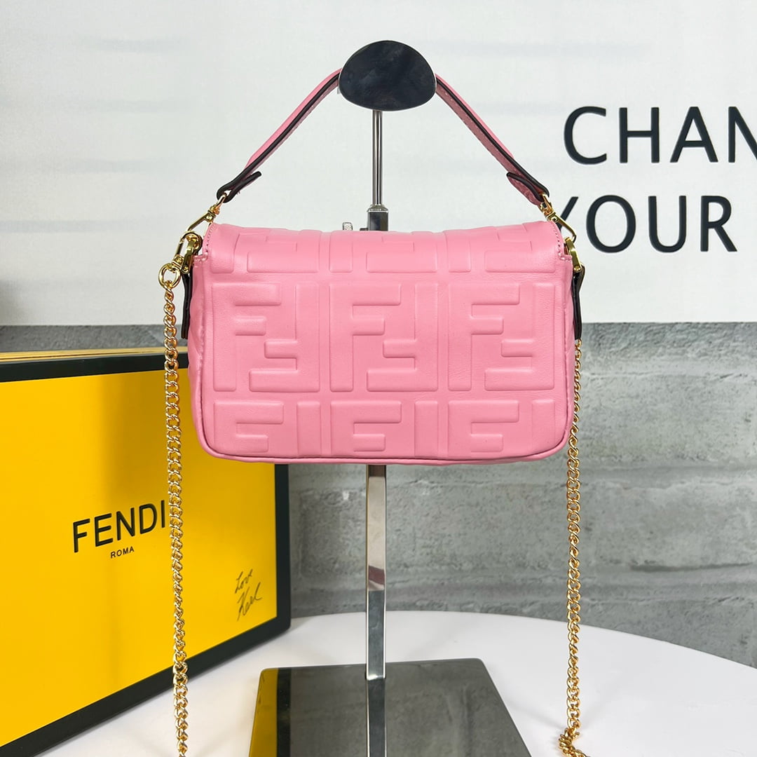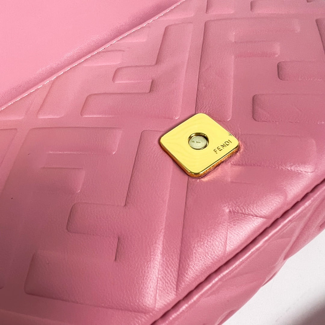 Clamshell magnetic snaps. Equipped with FF magnetic buckle. Lined with zipper bag. With removable shoulder strap, handbag can be shoulder or crossbody. (Sheepskin). Decorated with FF embossed pattern. Gold metal part number F0193