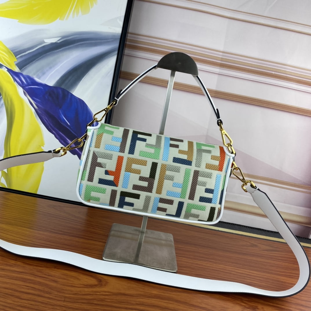 2023 Fendi’s latest baguette bag: very summery; Colorful rainbow 🌈F embroidery colors. This Fendi Baguette is sure to be a trendy item this summer! It looks great on the top; Attendance is also particularly high; It’s absolutely fine for a concave shape. Very lightweight. And its capacity is also very powerful; Easily meet your daily needs. With a short strap and a wide shoulder strap; Can be carried on one shoulder and crossbody. Very versatile. It’s easy to wear no matter what style you have. Carry it and you’ll be the brightest goddess in the crowd. Model F2029 Size 26-5-15CM