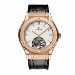 The Hublot Classic Fusion Tourbillon 505.OX.2610.LR White Dial Replica is a luxurious watch from Audemars Piguet. It features an automatic movement with a caliber of HUB6010 and a power reserve of 40 hours. The case is made of 904L stainless steel with a rose gold color. and the bezel is also made of 904L stainless steel with a rose gold color. The crystal is sapphire and the size is 45.00 mm. The bracelet is made of crocodile leather with a black color and adjustable links.