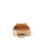 The Alma BB handbag is part of the Monopaname capsule, Nicolas Ghesquière’s ode to the City of Light. The Alma’s distinctive Art Deco shape is fashioned from beige Monogram canvas, featuring “Louis Vuitton Paris” in the style of the street signs of Paris. The ocher-and-white stripe that bisects the bag is a historic House design element.