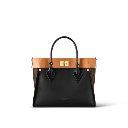 The Onthego medium handbag features classic Monogram canvas and Monogram Reverse canvas on both sides, presenting different styles. Toron dual handles and shoulder straps allow for a variety of carry options.