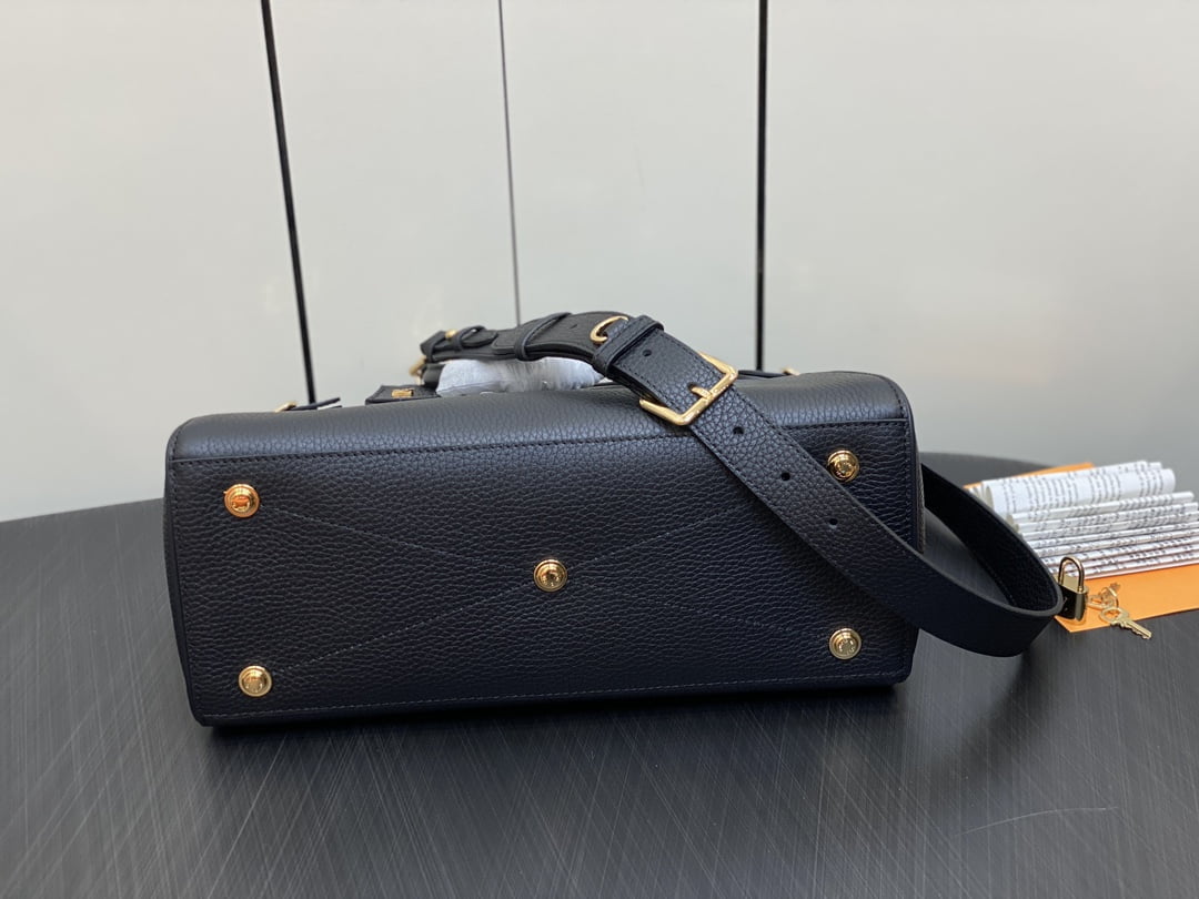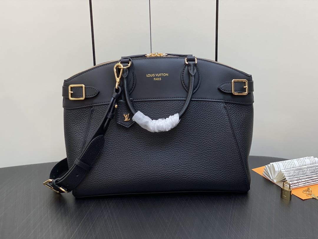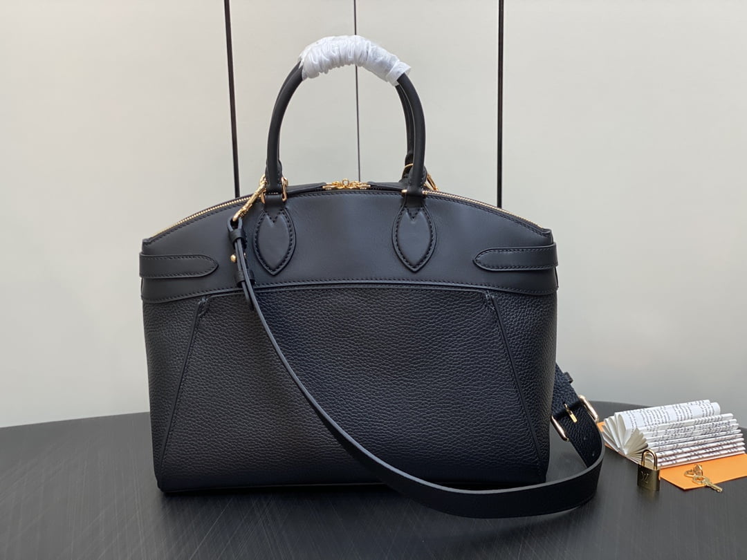 The zys lock it mm Bag m22914 22925 22927 23061 ays lock it mm Bag is a sophisticated and practical combination of grainy taurillon leather and smooth calfskin, complete with gold finish buckle and hardware. Symbolic house decorations include padlocks, key bells and hot-stamped Louis Vuitton signatures. This tote comes with an articulated top handle and a detachable strap, offering a variety of carrying options. Dimensions: 36 x 29 x 15 cm