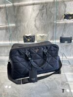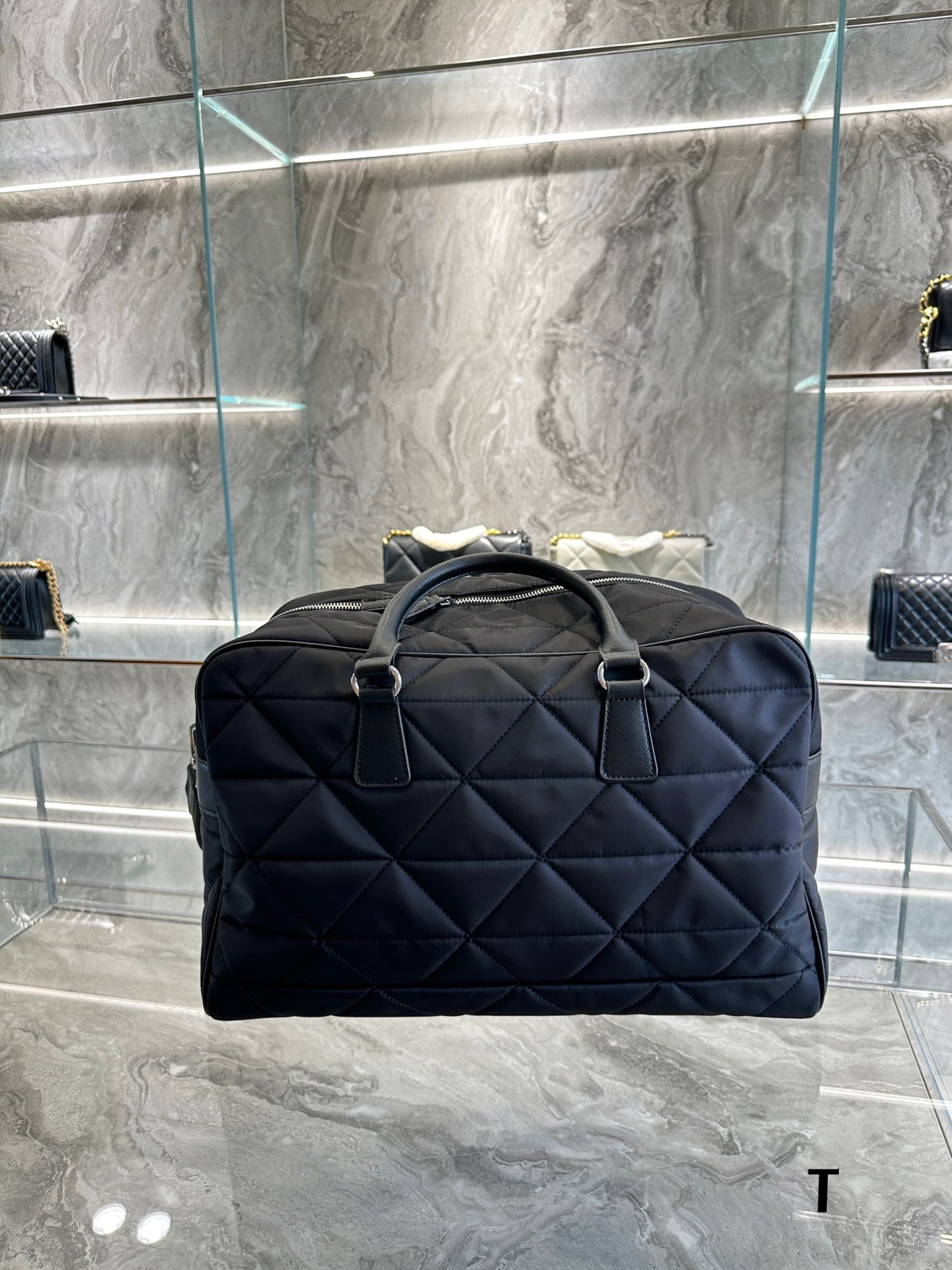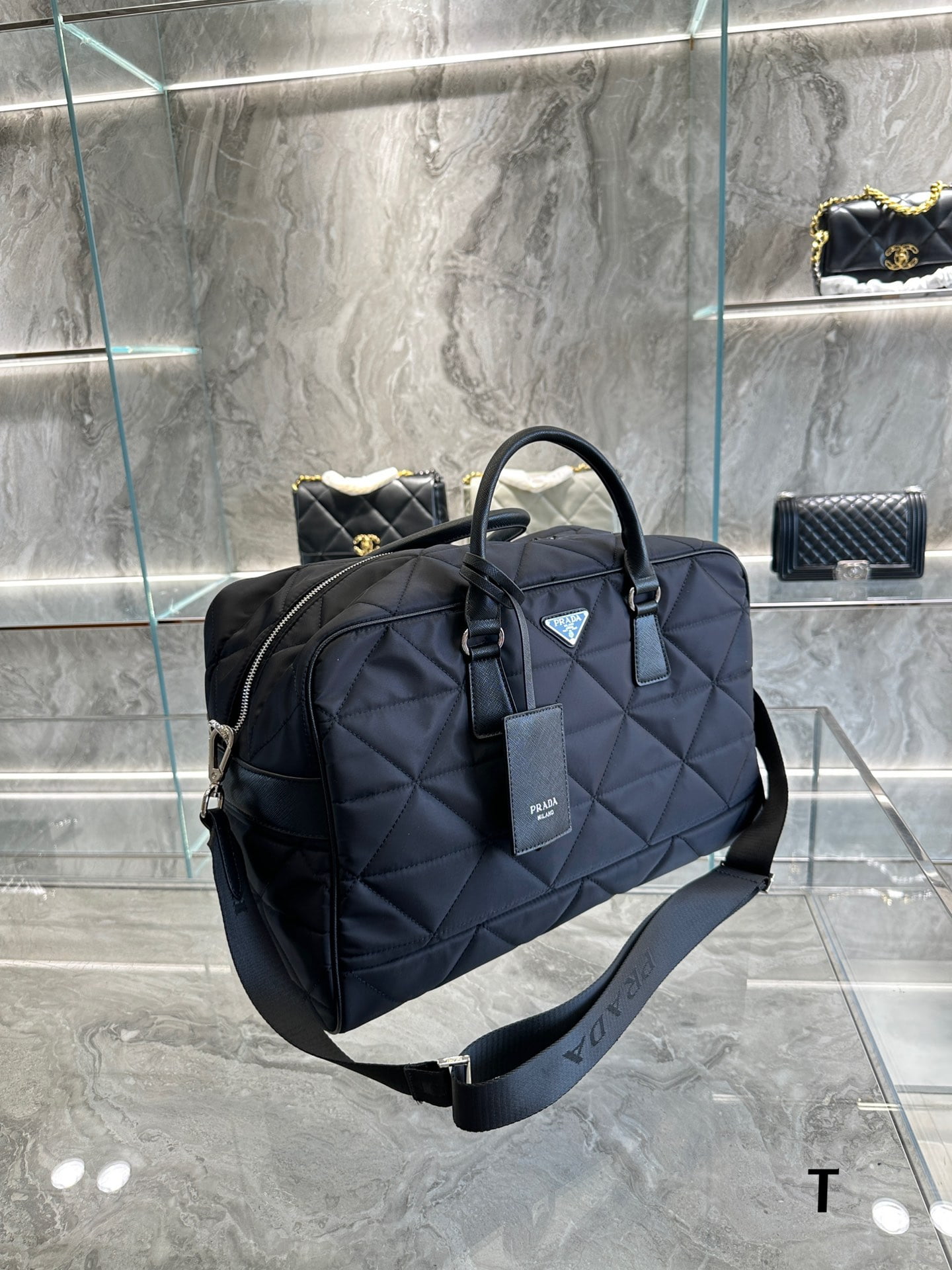 The latest model from Pra! Quilted RE-NYLON Travel Bag! Quilting elements inspired by the brand’s signature geometric shapes are spread out in this avant-garde, sporty Re-Nylon recycled nylon travel bag to interpret the chic design! Emblematic enamelled metal triangle logos adorn the front! Can be a crossbody bag travel bag handbag! Brand unique Italian imported parachute fabric with imported cowhide, advanced anti-splash fabric, active shoulder strap can be taken off, note that this shoulder strap can be adjusted, can be a shoulder can be crossbody, bag mouth with a lock head, quite safe! Really quite practical and high-end, rare good bag! Size: L 45 x H 30.5 x W 15# Men’s bag # Luxury bag