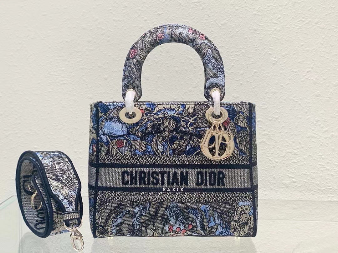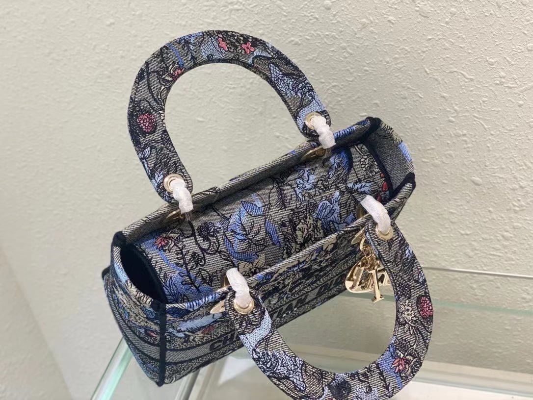 The five-compartment embroidered Magic Garden handbag combines classic elegance with a stylish look. Crafted in denim fabric, the entire body is decorated with multi-coloured diorjardinmagique pattern embroidery, drawing inspiration from the wizarding world to display charming pastoral patterns. The front is decorated with the christian dior paris logo, and the light gold finish metal di.or pendant raises the tone and adds a touch of inspiration to the exquisite silhouette. Medium style with detachable double-sided embroidered wide shoulder strap, portable or crossbody. Dimensions :24x20x11 cm