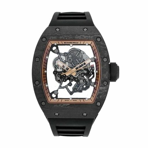 The Richard Mille RM055 Bubba Watson Replica is a luxurious watch with a sleek black design. It features an automatic movement with a caliber RM 55 and a power reserve of 60 hours. The precision of the watch is within COSC certification limits. with a sweep motion second hand. The case is made of 904L stainless steel and has a sapphire crystal. The bracelet is made of rubber and has adjustable links for all sizes. The dial is transparent with stick and dot indices. and the hands are made of 904L stainless steel.