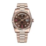 Introducing the Rolex Day-Date 128235 AR Rose Gold Wrapped Chocolate Dial Replica. a timepiece that embodies the pinnacle of luxury and precision. This exquisite watch is not just an accessory but a statement piece. crafted meticulously to mirror the elegance and sophistication of the original Rolex design. From the moment it graces your wrist. you’ll be enveloped in an aura of opulence. resonating the timeless appeal of the renowned Swiss brand.