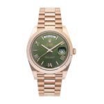 Embrace the timeless elegance and sophistication of the Rolex Day-Date Rose Gold President Green Roman Dial 228235 Replica. This exquisite timepiece blends traditional craftsmanship with modern design. resulting in a peerless accessory that radiates prestige and luxury. Imagine the gleam of the rose gold color catching the light. drawing admiring glances as you wear this masterpiece on your wrist.