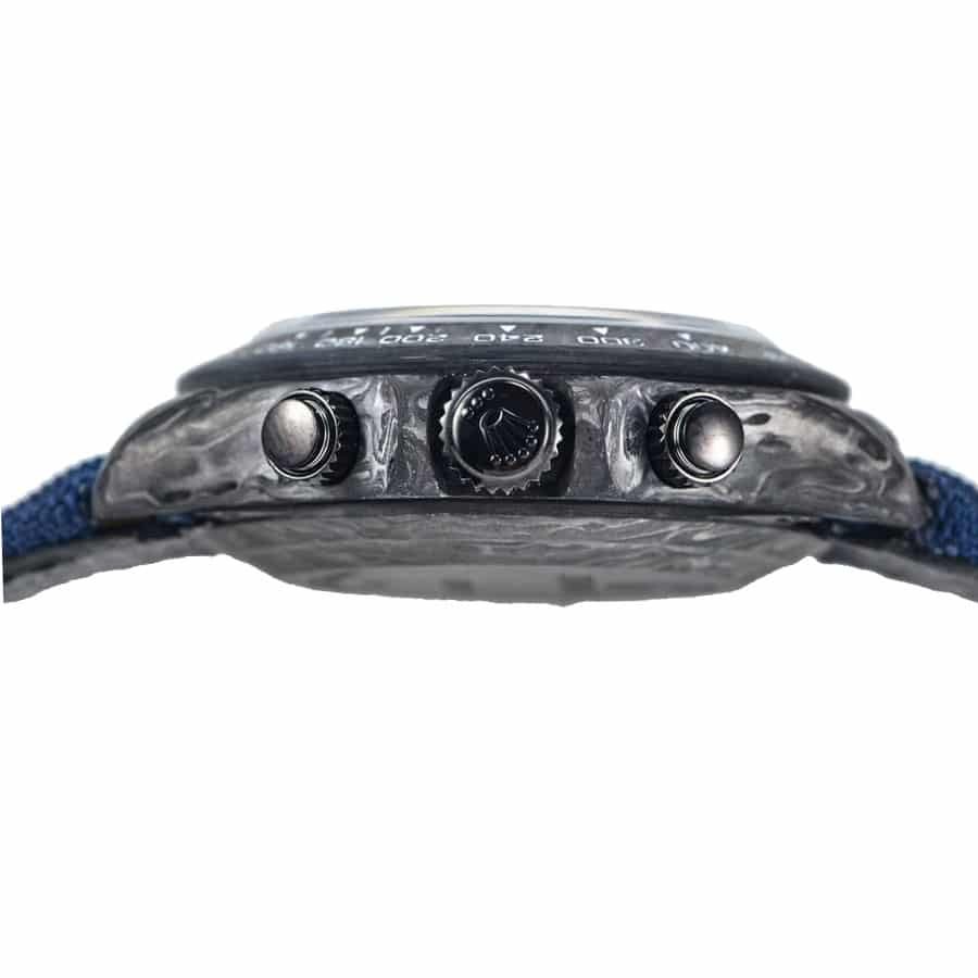 With its robust yet sleek 40.00 mm size and 15.40mm thickness. the Daytona Cosmograph fits comfortably on your wrist. while its scratch-resistant sapphire crystal ensures lasting clarity and protection. The fabric bracelet. designed for all sizes. wraps snugly around your wrist. secured by a 904L stainless steel deployment clasp in matching forged carbon color. As you tighten the clasp. you’ll notice the intricate color fish pattern dial with stick and dot indices come into clearer view. a unique design that sets this replica apart from generic copies.