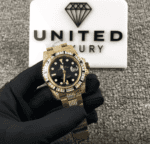 The dial is black with stick and dot indices. The hour markers are made of 904L stainless steel and the hands are made of 904L stainless steel in the Rolex Professional (Maxi) style. The movement is automatic with a caliber of 3186 and a power reserve of 60 hours. It is precision certified within COSC certification limits and has a sweep motion second hand. It is also water resistant up to 30m and comes with a full 2 year international warranty. This watch is a perfect replica of the original and even your jeweler won’t be able to tell the difference.