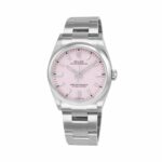 The Rolex Oyster Perpetual 124300 is a luxurious watch that is sure to impress. The watch features a 904L stainless steel case and bezel. with a sapphire crystal for added protection. The dial is a beautiful pink color. with stick and dot hour markers made of 904L stainless steel. The Oyster bracelet is adjustable and made of 904L stainless steel. with a fold clasp in white gold.