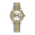 The Rolex Datejust 279383RBR-0003 Yellow Gold Automatic Champagne & Diamond Dial Jubilee Replica is a stunning watch. It features a 904L stainless steel case with a yellow gold and steel color. a sapphire crystal. and a 904L stainless steel bezel with a yellow gold and gem-set color. The dial is silver with gem-set indices and 904L stainless steel hour-markers and stick hands.