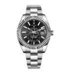 The Rolex Sky-Dweller Black Dial 326934 Oyster Replica is a striking watch. It features a 904L stainless steel case with a white gold and steel bezel. and a sapphire crystal. The 42.00 mm case is 14.01 mm thick. The Oyster bracelet is adjustable and made of 904L stainless steel with a fold clasp. The black dial has stick and dot indices. and the hands are made of 904L stainless steel.