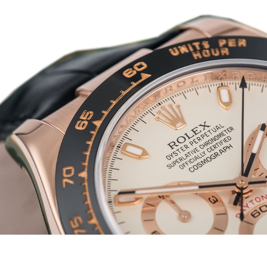 The Rolex Cosmograph Daytona White Dial 116515LN-0003 Replica is a high quality watch. It features a 904L stainless steel case with a rose gold color and a black bezel. The watch is 40.00 mm in size and 12.40 mm in thickness. The dial is white with stick and dot indices. and the hands are made of 904L stainless steel. The movement is an automatic caliber 4130 with a power reserve of 60 hours and a precision of (-3/+3 sec/day) within COSC certification limits. The bracelet is made of leather with an adjustable link and a 904L stainless steel folding clasp in rose gold.