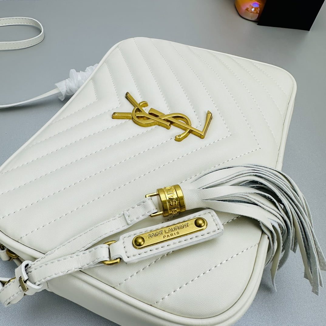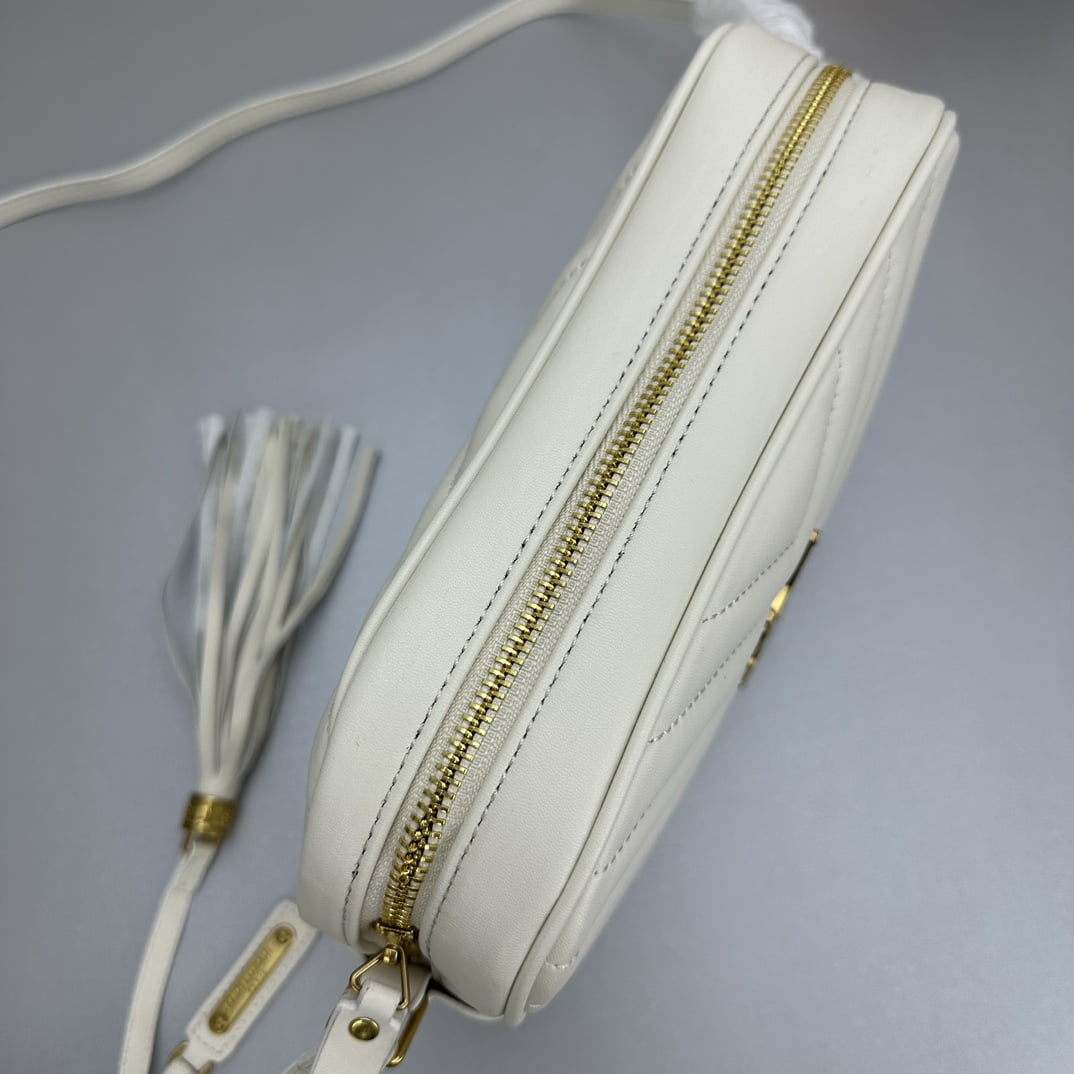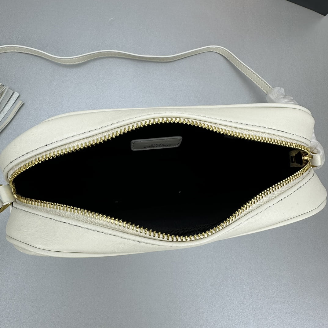 MONOGRAM SAINT LAURENT shoulder bag with adjustable leather strap, detachable leather fringe, metal trim with YSL at center and quilted stitching