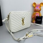 Calfskin forged lining with LAURENT-ENGRAVED metal plaques adorn the zipper. Brush bronze tone metal hardware. Slot pocket shoulder strap vertical: 62 cm