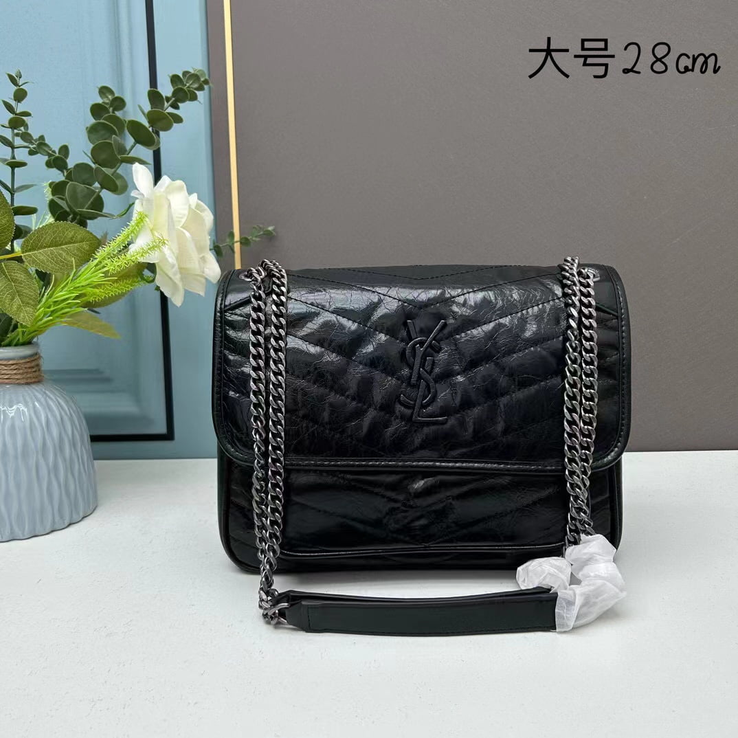 LAURENT front clamshell bag with real leather-covered YSL trim, chain and leather multi-purpose shoulder strap, center compartment and open back pocket. Size 28CM imported leather dual-purpose chain shoulder strap 1 center compartment, 1 inner bag, 1 zipper pocket, 1 open progen, 1 flip bottom pocket